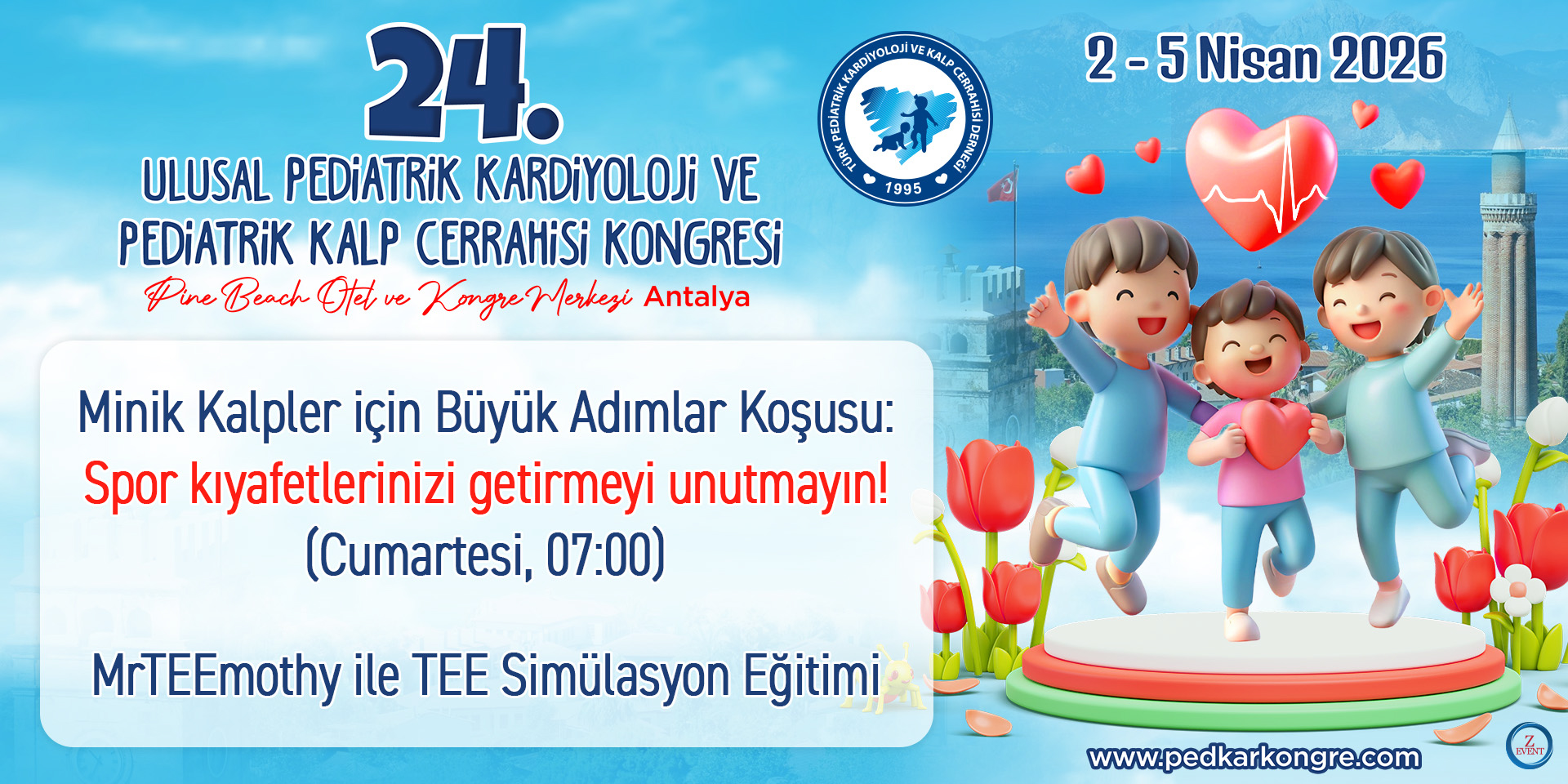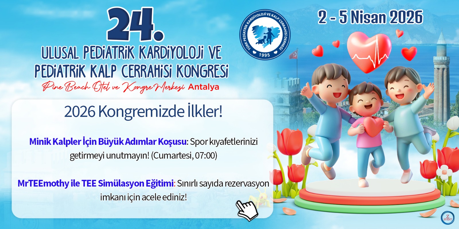 Çocuk kalp hastalıklarına ve doğuştan kalp hastalıklarına emek veren değerli meslektaşlarımız, 24. Ulusal Pediyatrik Kardiyoloji ve Pediyatrik Kalp Cerrahisi Kongresi’ni 2-5 Nisan 2026 tarihleri arasında Antalya’da Pine Beach Otel ve Kongre Merkezi’nde düzenleyeceğimizi ilan etmekten ve sizleri kongremize davet etmekten mutluluk duyuyoruz.
